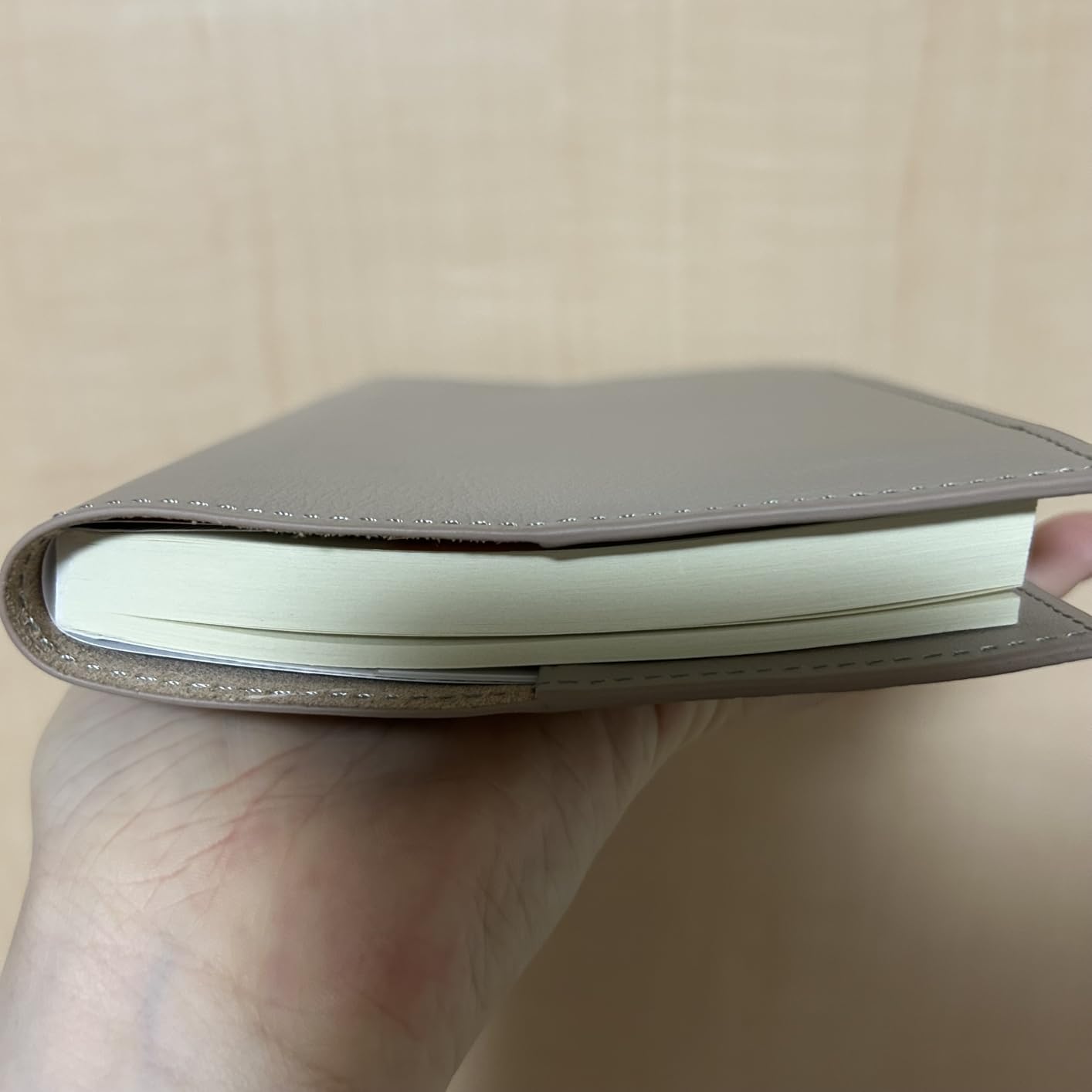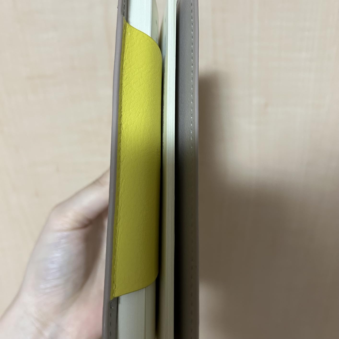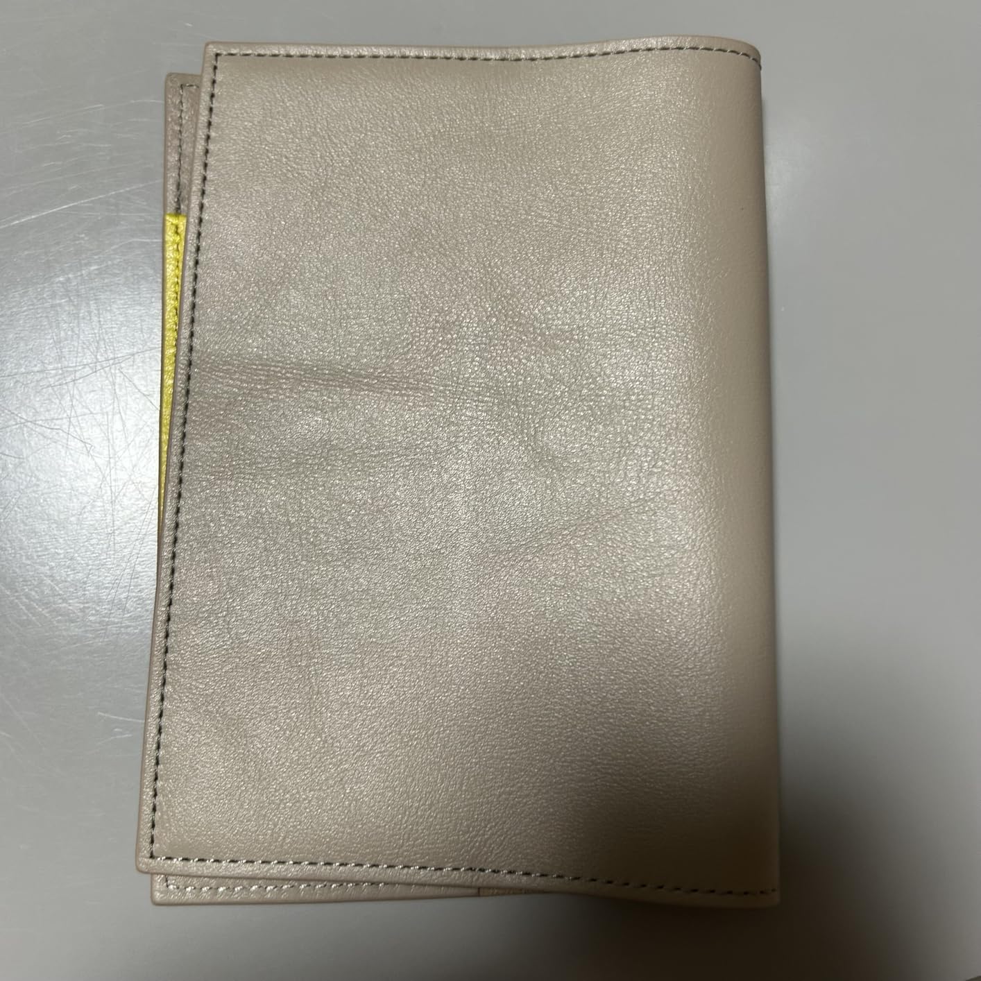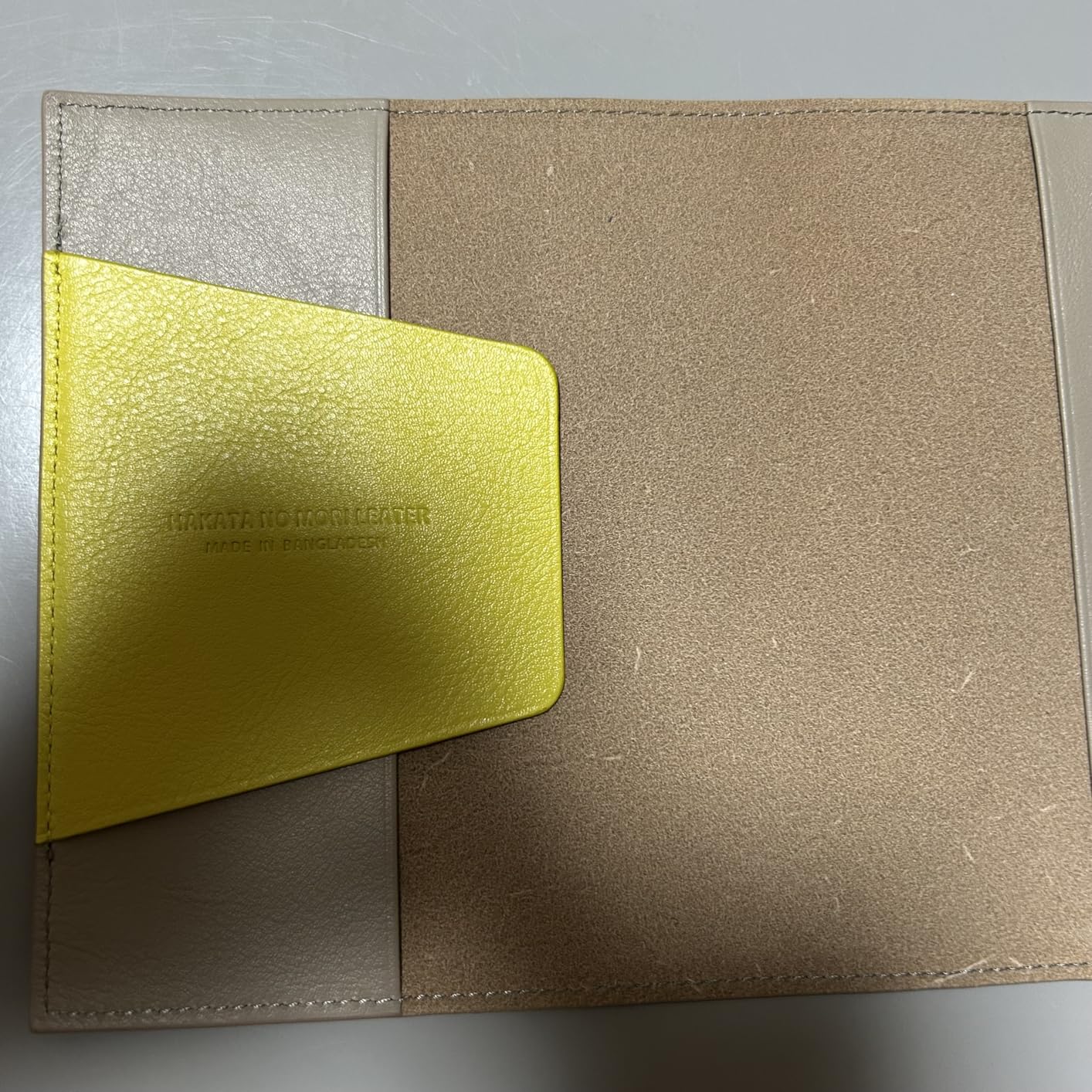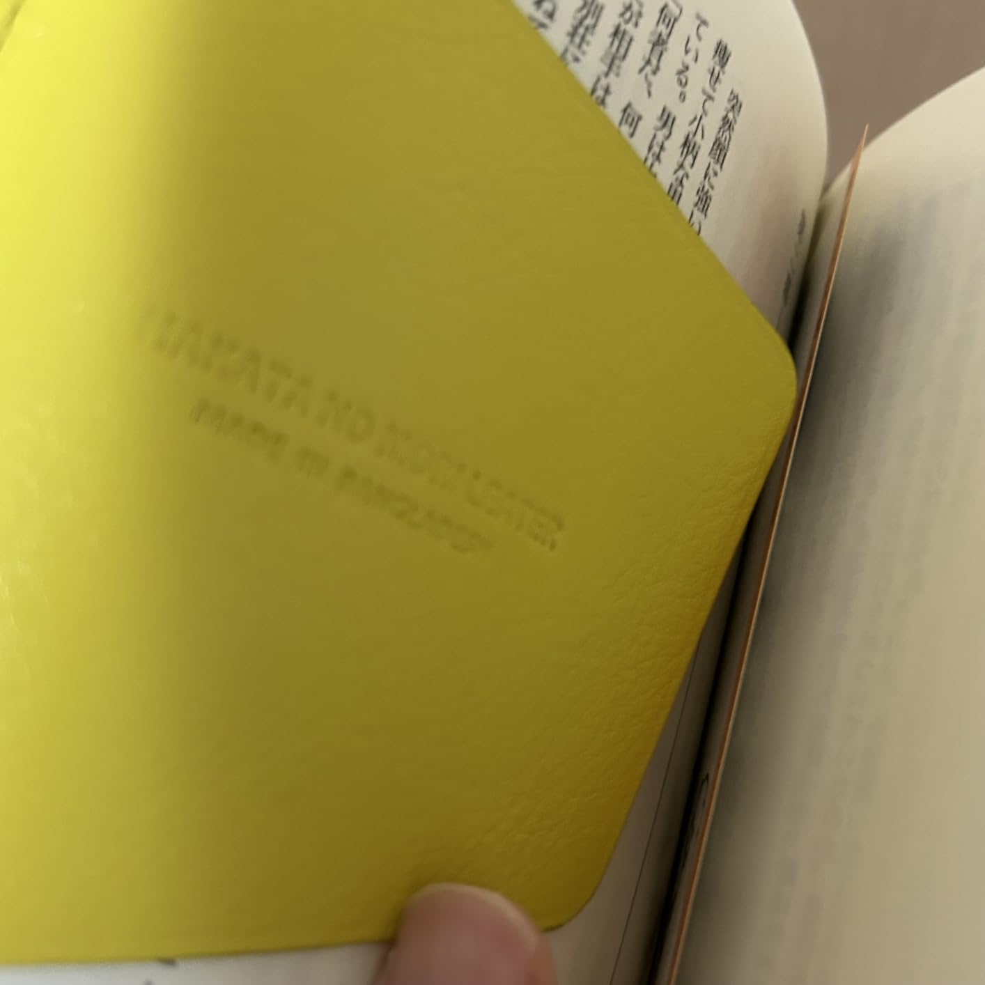 ぱっと見は本革とは思えないシンプルな見た目ツルッとしているが指と馴染むテクスチャ縫製もしっかりしていて歪みやほつれはない(あってもそれは愛嬌なのかも)一番の特徴は「裏表紙と一体化したしおり」ベージュグレーに明るい黄色という選択が小気味いい使うごとに文庫に馴染んでいくのを愉しむブックカバーよきです